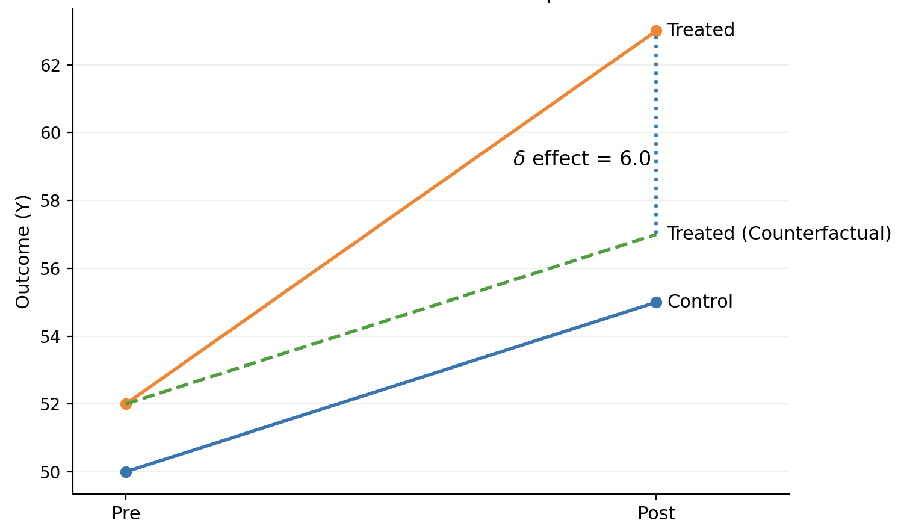 \[Y_{it} = \alpha + \beta \cdot \text{Treated}_i + \gamma \cdot \text{Post}_t + \delta \cdot (\text{Treated}_i \times \text{Post}_t) + \varepsilon_{it}\]Classic DiD Implementation: 2 Groups and 2 Periods